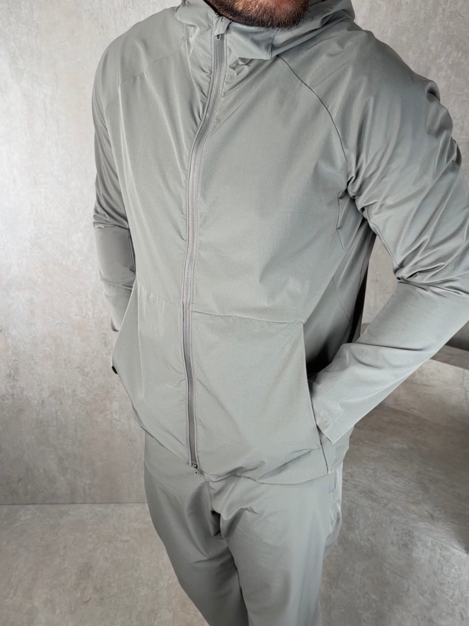 - Lightweight jacket with hood and full zip fastening