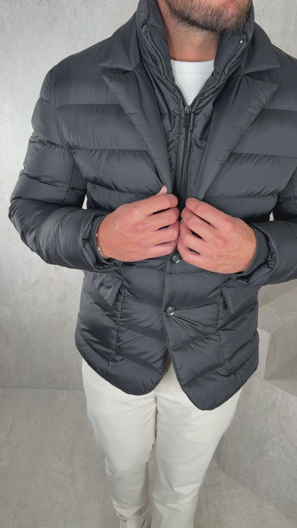 Introducing the Quilted Down Coat - Combining lightweight warmth with a refined tailored look, this coat delivers the perfect balance of comfort and style. The quilted body adds structure to the design, while the lapel collar and button fastening create a sharp, elevated finish. An additional inner zip layer provides extra warmth and a secure fit, while the front patch pockets and discrete arm pocket brings subtle detailing. Designed to transition seamlessly from everyday wear to smarter casual settings.